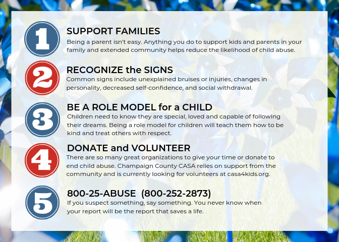 Blue PINWHEELS are the national symbol for child abuse and neglect prevention. The pinwheel represents the happiness and whimsy of childhood, and it speaks to our belief that every child in our community deserves the opportunity to thrive – which starts in a safe and permanent home. The mission of Champaign County CASA is to stand up for children in the court system who have experienced abuse and neglect. It is our ultimate goal to give them hope and help them be kids again. These kids are Our Kids, and we all have a role in keeping them safe.